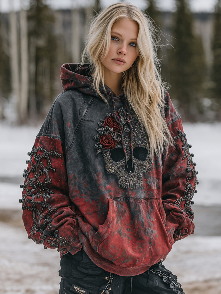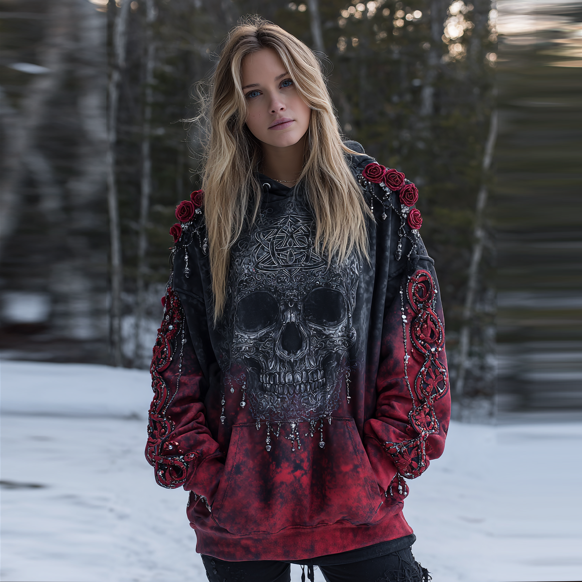 Women's Viking-style Rose And Skull Long-sleeved Hooded Sweater