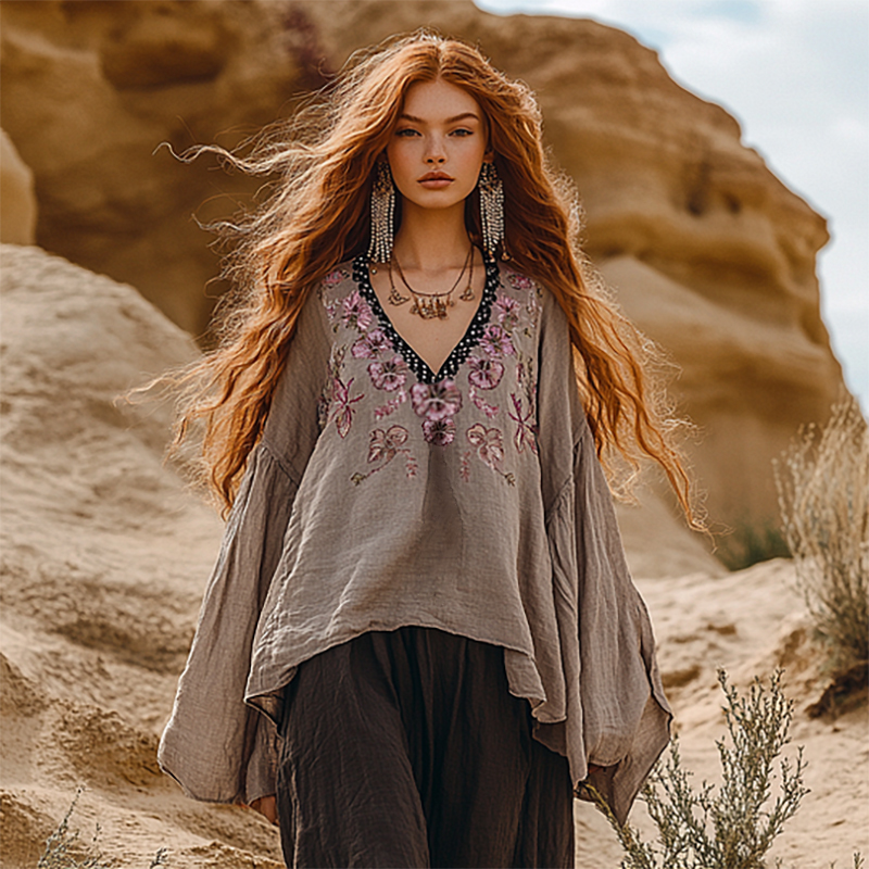Ethnic Style Embroidered Linen V Neck Long Sleeve Shirt