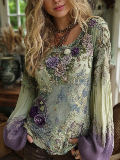 Vintage Classic Purple Lavender And Floral Embroidered Linen Long Sleeve Shirt