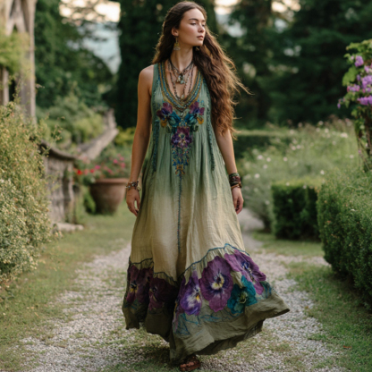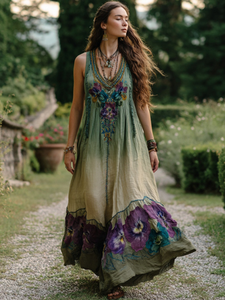 Vintage Purple Flowers Embroidered Gradient Linen Maxi Dress