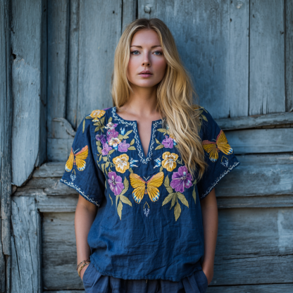 Women's Purple Pansy Butterfly Embroidery Linen V-neck Shirt