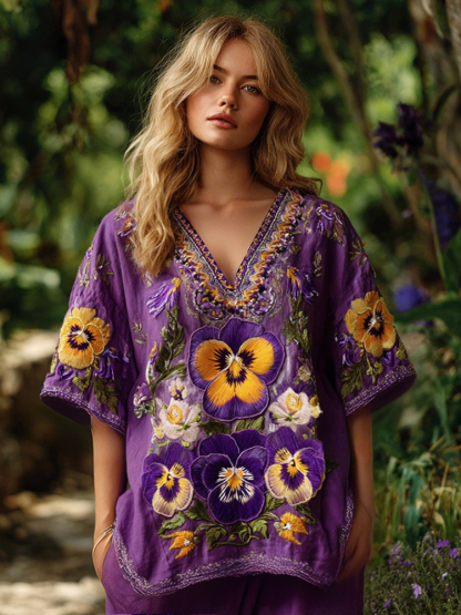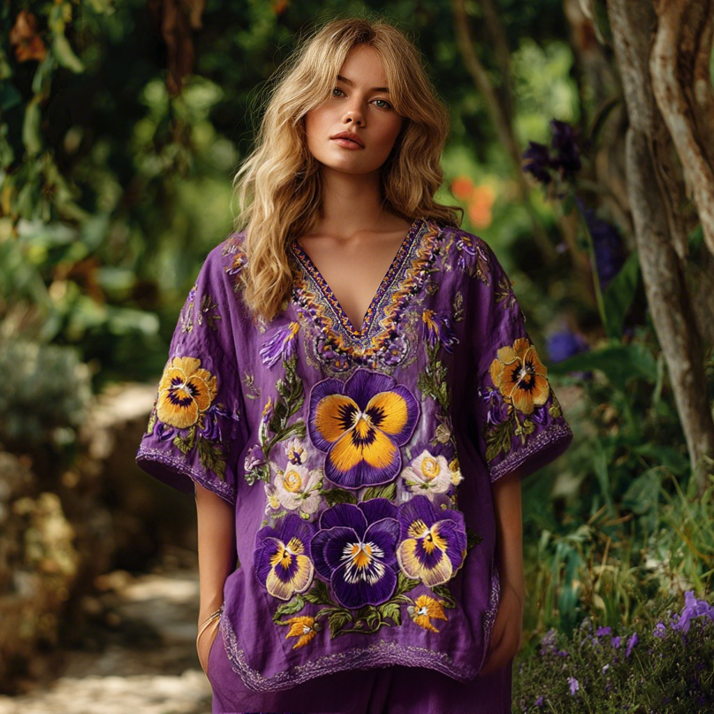 Women's Purple Pansy Embroidery Design Print Three-quarter Sleeves Shirt
