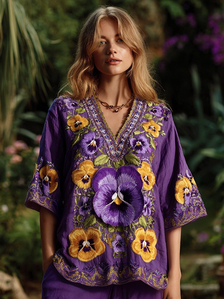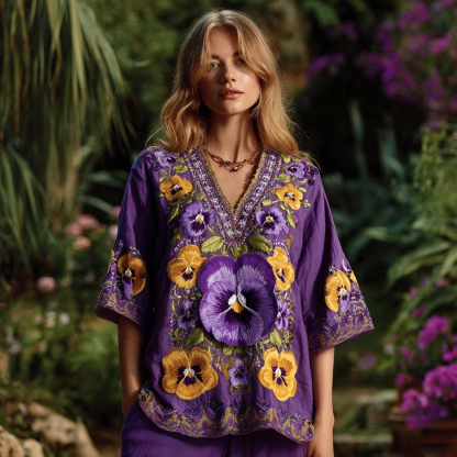 Women's Purple Pansy Embroidery Design Print Three-quarter Sleeves Shirt