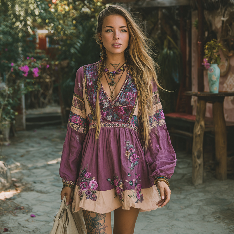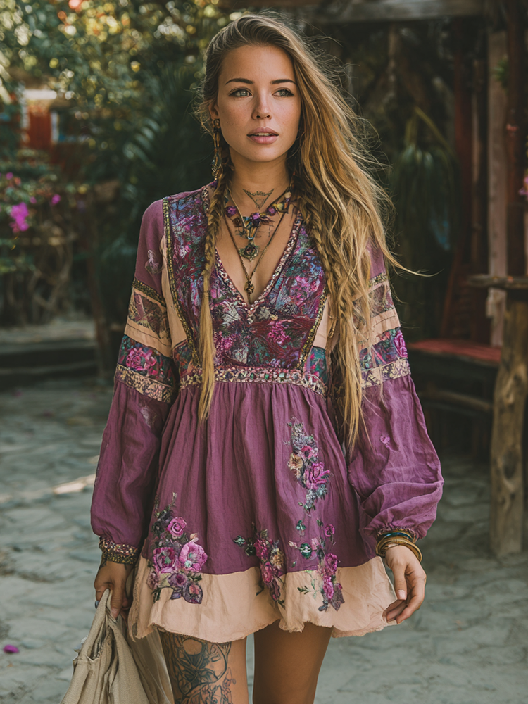 Women's Retro Ethnic Floral Long Sleeve Short Dress