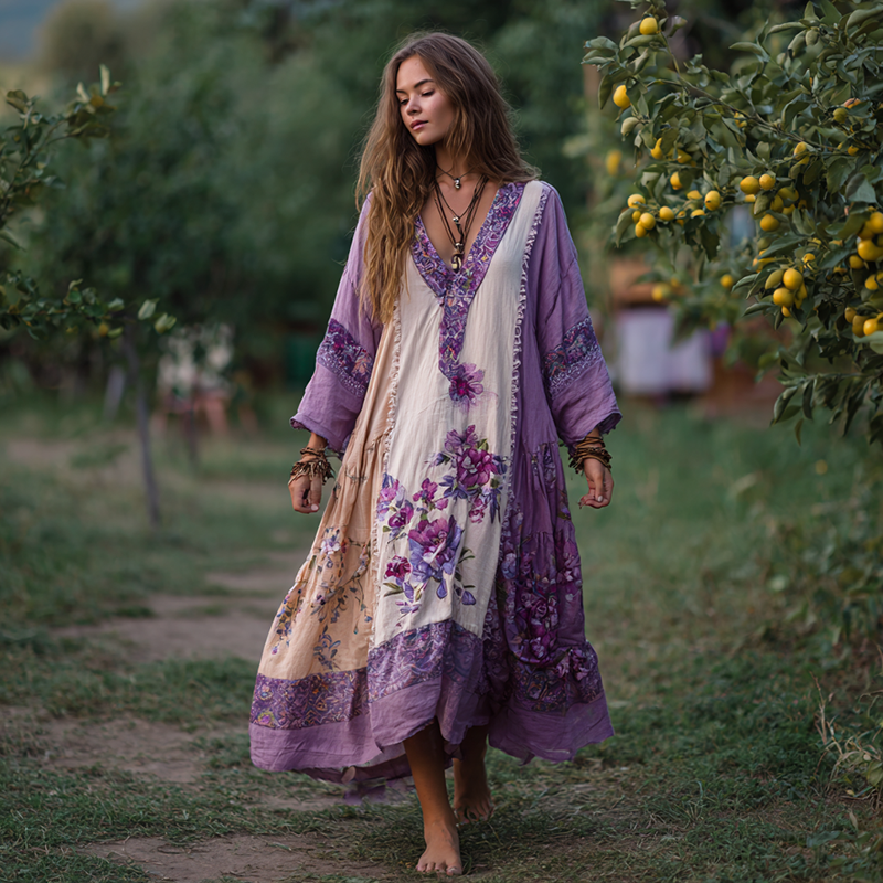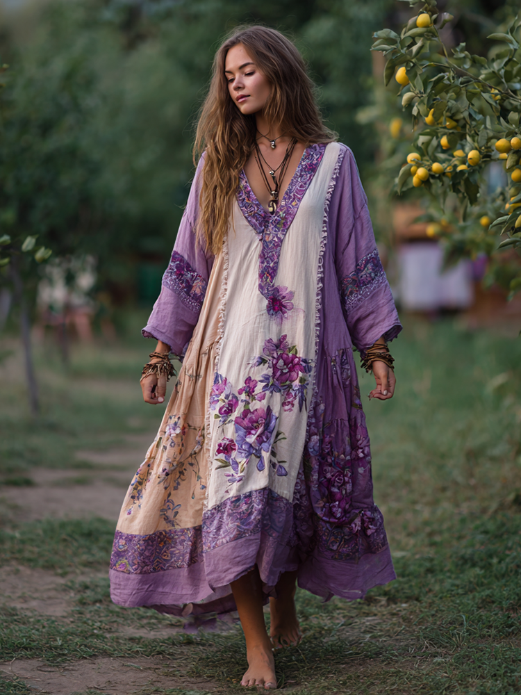 Women's Vintage Ethnic Floral Long Sleeve Maxi Dress