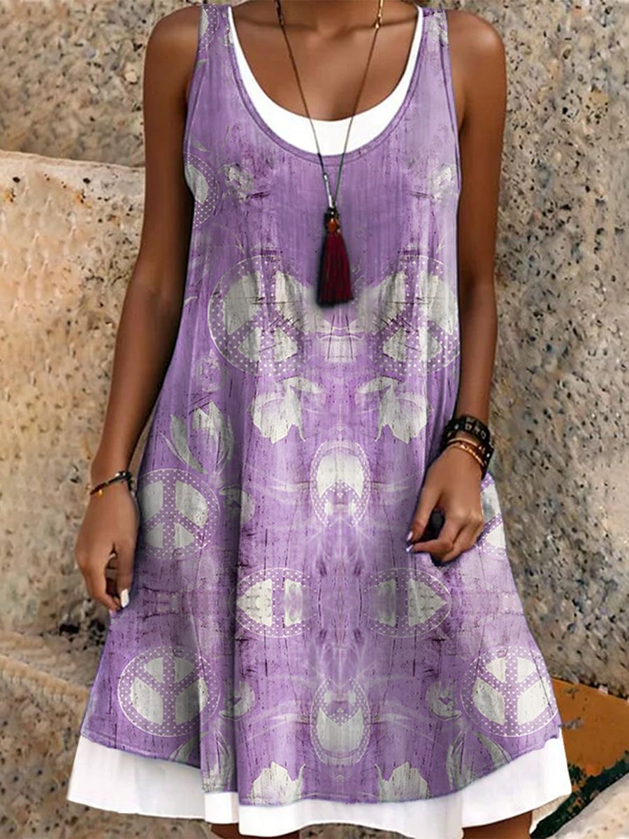 Women's Colorblocked Pattern Art Print Round Neck Sleeveless Cotton Pocket Dresses