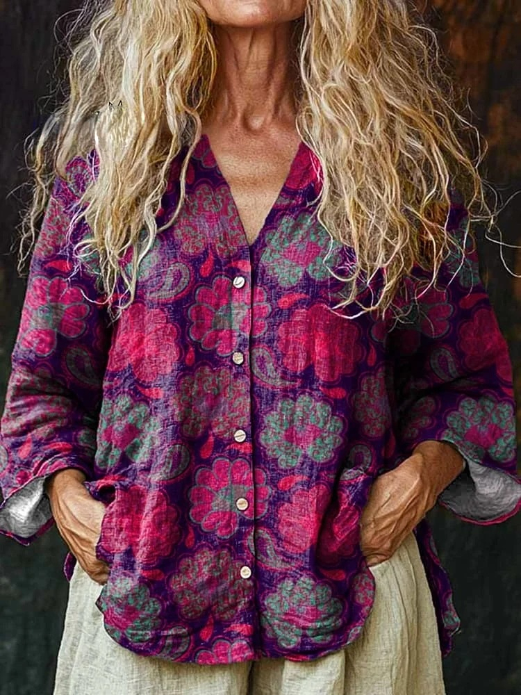 Blooming Night Floral Pattern Printed Women's Linen And Cotton V-Neck Casual Shirt