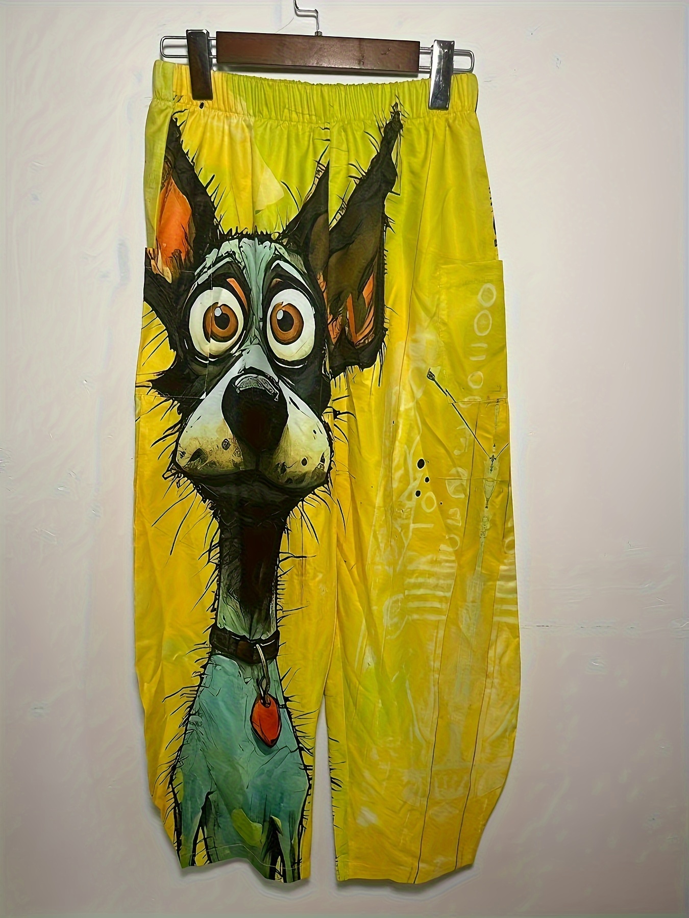 Dog Print Elastic Waist Pants, Casual Wide Leg Patched Pockets Pants, Women's Clothing