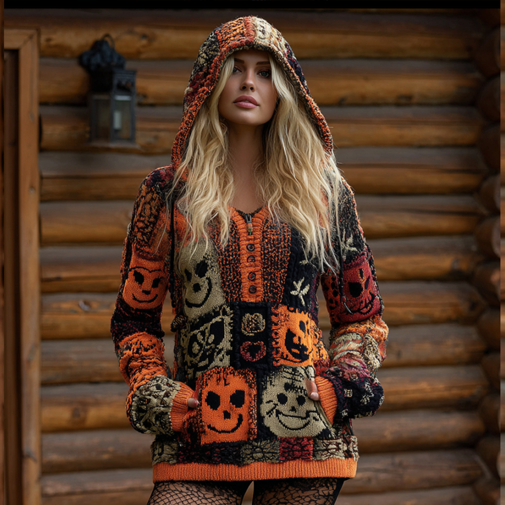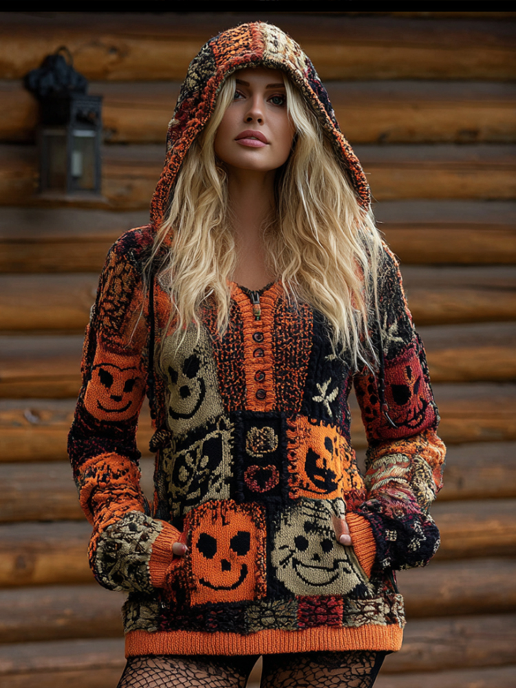 Halloween Patchwork Hooded Casual Knitted Top