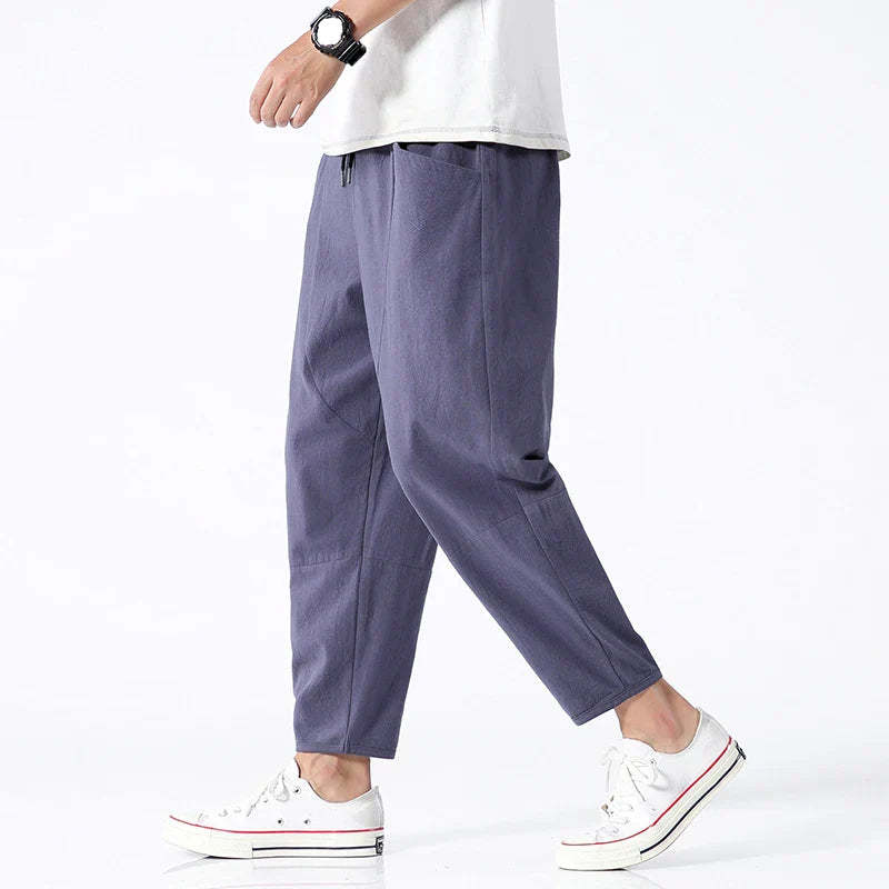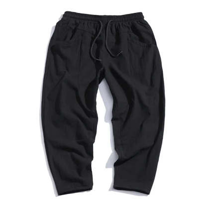 Designed for all-day ease, these cotton-linen cropped pants feature a relaxed, tapered fit with articulated paneling for added flexibility. The adjustable drawstring waist ensures a personalized fit, making them ideal for casual outings or laid-back workdays.