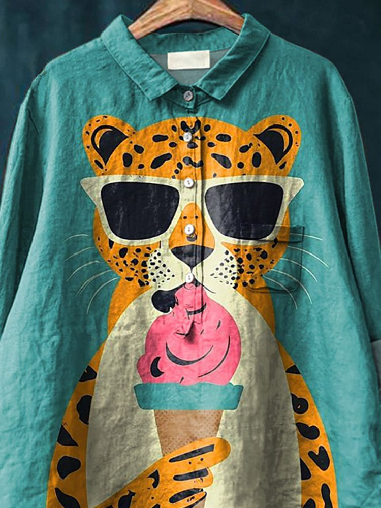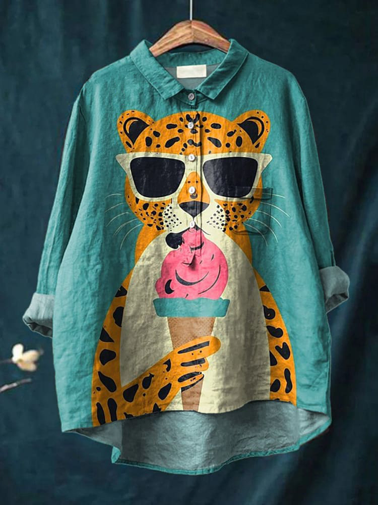 Leopard And Ice Cream Graphic Printed Women's Casual Cotton And Linen Shirt