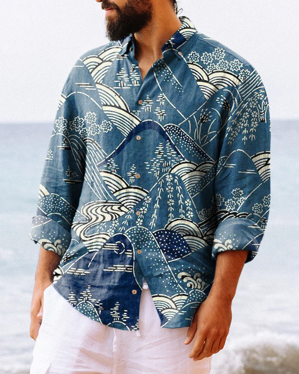 Men's Japanese Landscape Floral Print Button Long Sleeve Casual Shirt