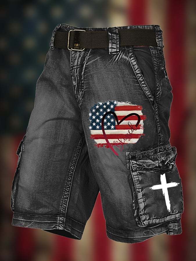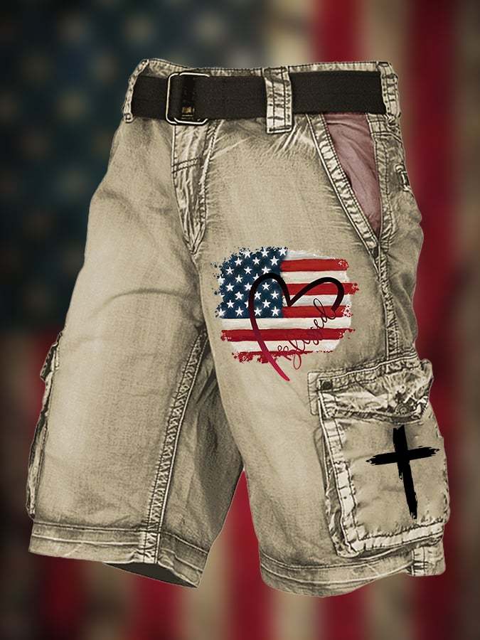 Men's Vintage Flag Multi-Pocket Print Cargo Shorts