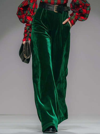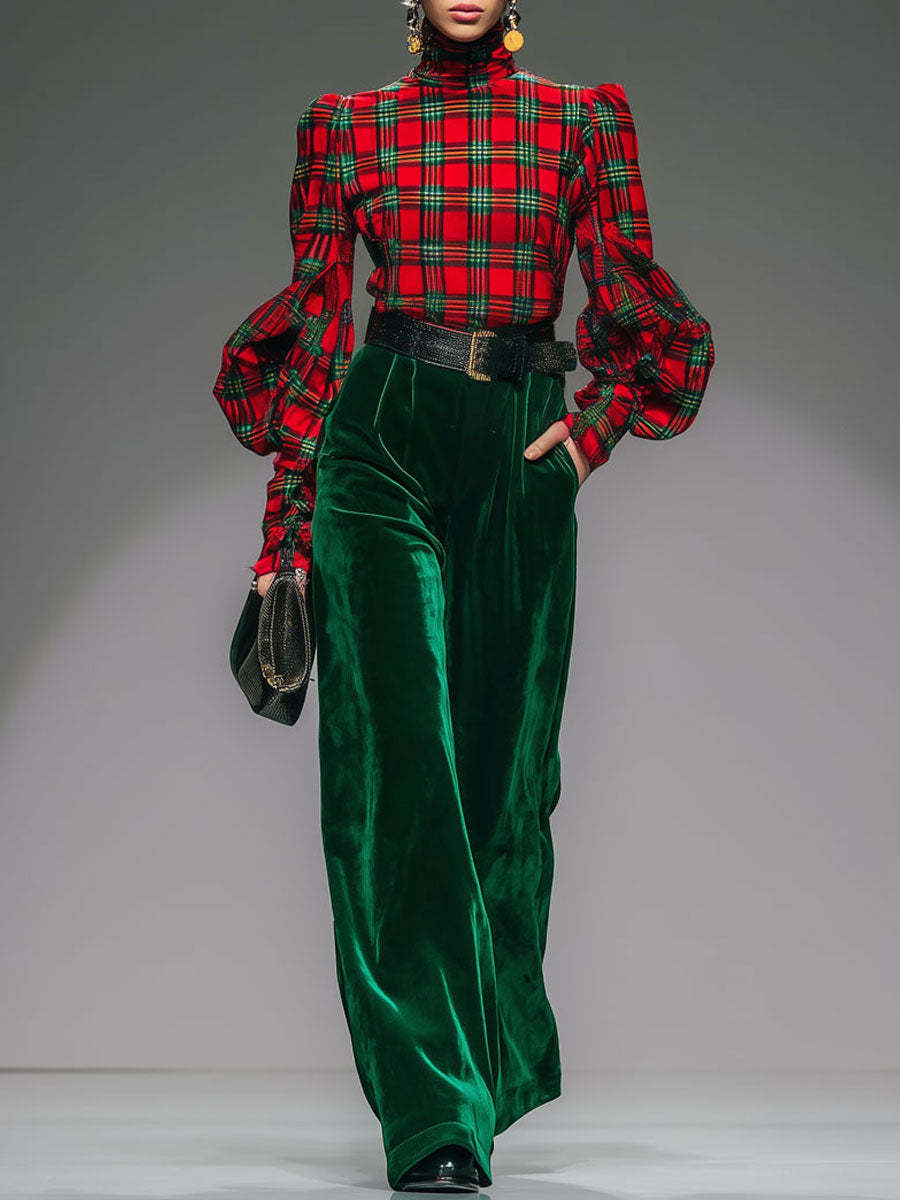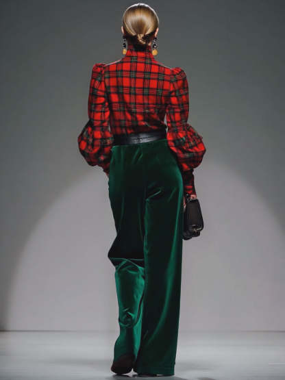 Complementing the top is a pair of wide-leg pants, also made from sumptuous velvet, which offers a fluid silhouette that is both comfortable and stylish. The wide-leg design provides a flattering fit that elongates the legs, while the cohesive plaid pattern ensures a coordinated and polished appearance. This set can be worn together for a unified look or mixed with other wardrobe staples for versatile styling options. Pair it with ankle boots or heels to enhance the ensemble's sophistication, and add minimal accessories to let the plaid and velvet textures shine. Ideal for those who appreciate the fusion of retro-inspired design with contemporary fashion, this plaid velvet turtleneck and wide-leg pants set is a standout addition to any fashion-forward wardrobe.
