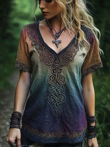 Viking Celtic Knot Embroidery Gradient Art Vintage Linen T Shirt