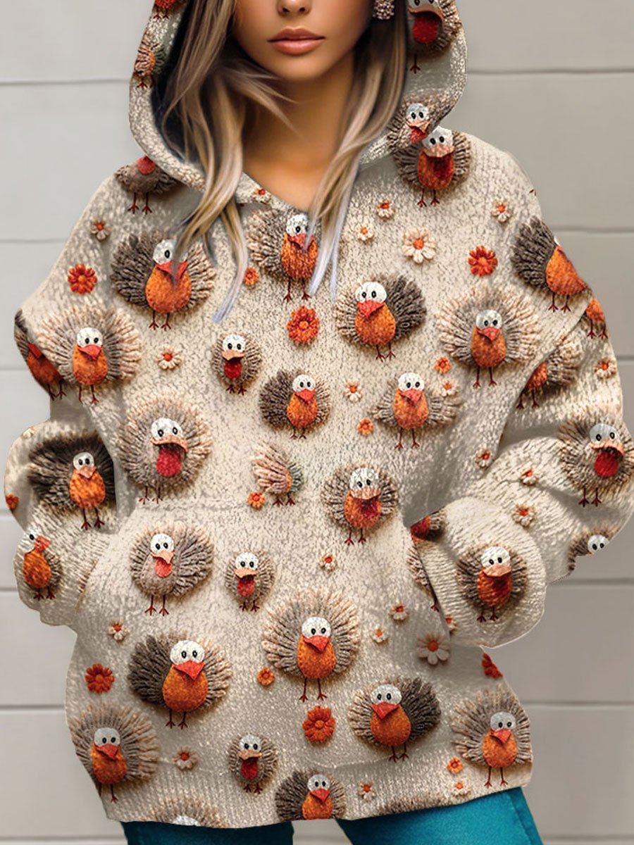 Vintage Cute Little Turkeys Fall Thanksgiving Print Knit Pullover Hooded Sweater