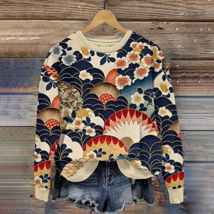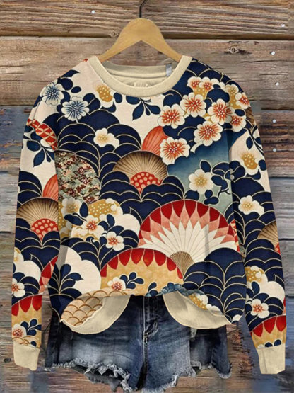 Vintage Japanese Art Printed Casual Round Neck Sweatshirt