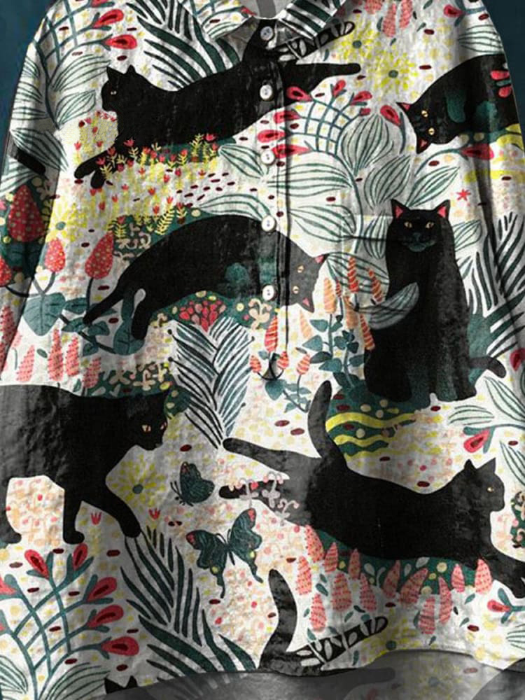 Vintage Lovely Cats Floral Art Print Casual Cotton And Linen Shirt