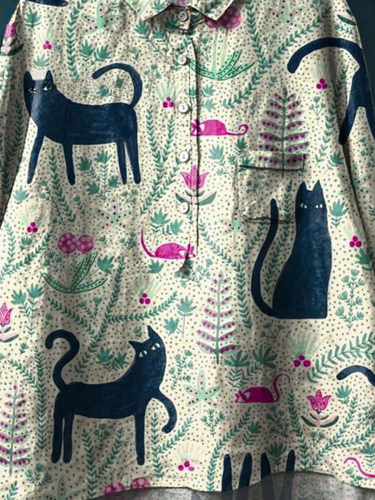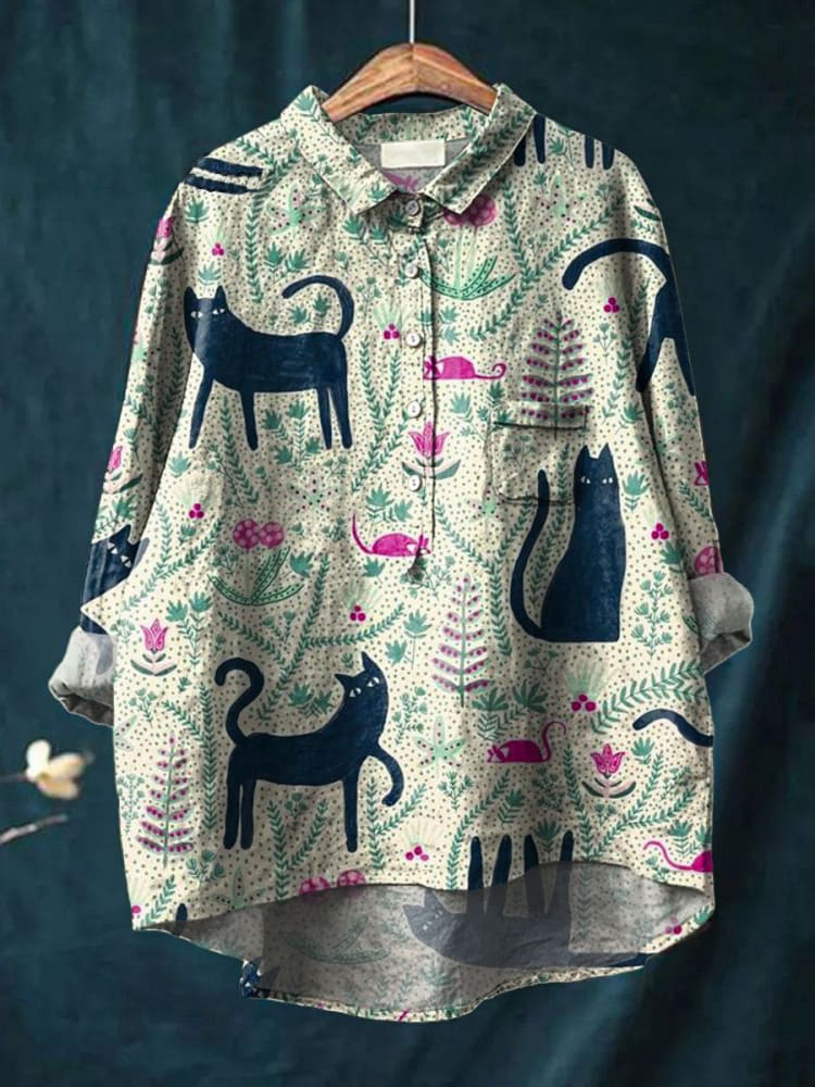 Vintage Lovely Cats Floral Art Print Casual Cotton And Linen Shirt
