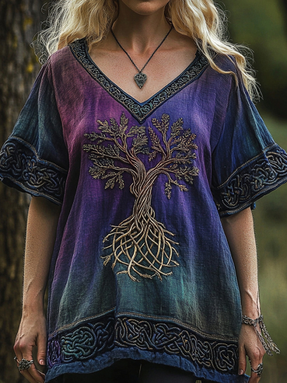Vintage Viking Tree Of Life Gradient Embroidery Art Women's Linen T Shirt