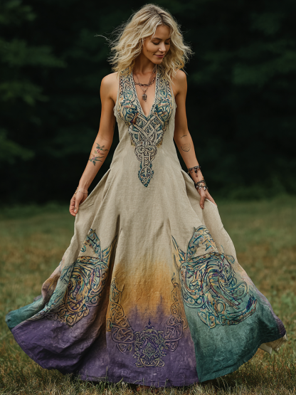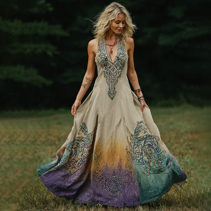 Women's Celtic Knot Gradient V-neck Belted Maxi Dress