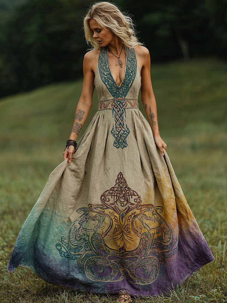 Women's Celtic Knot Ombre V-neck Belted Maxi Dress