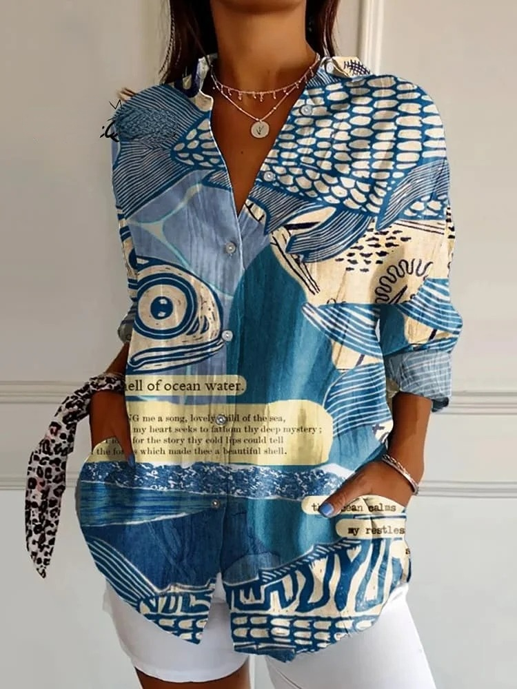 Women's Fish Art Print Casual Cotton Shirt