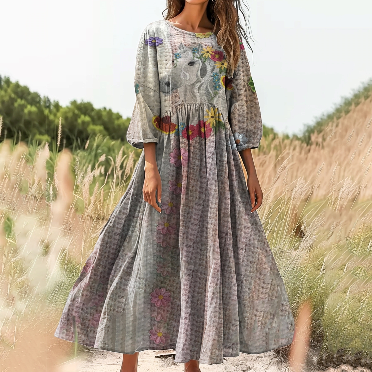 Women's Floral Horse Pattern Art Print Cotton Round Neck Dress