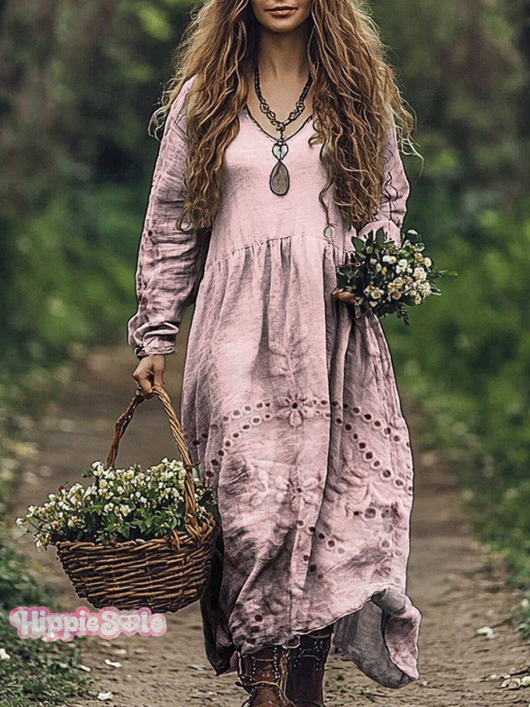 Women's Floral Textured Art Patterns Print Casual V-Neck Pocket Cotton Dress