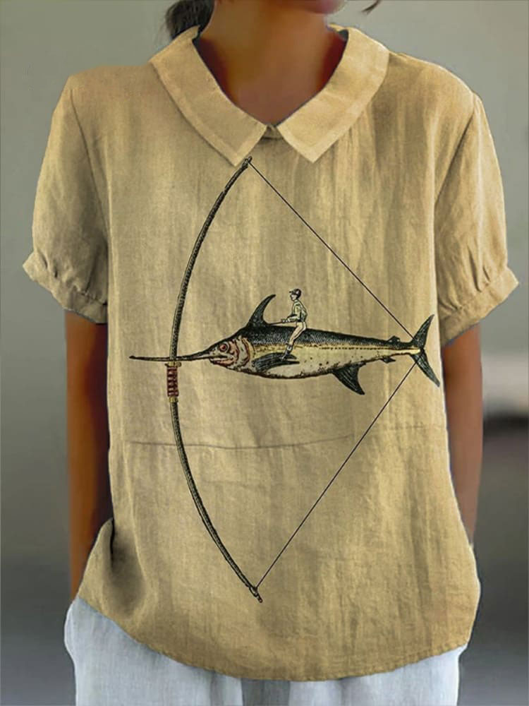 Women's Interesting Tuna Print Casual Cotton And Linen Shirt