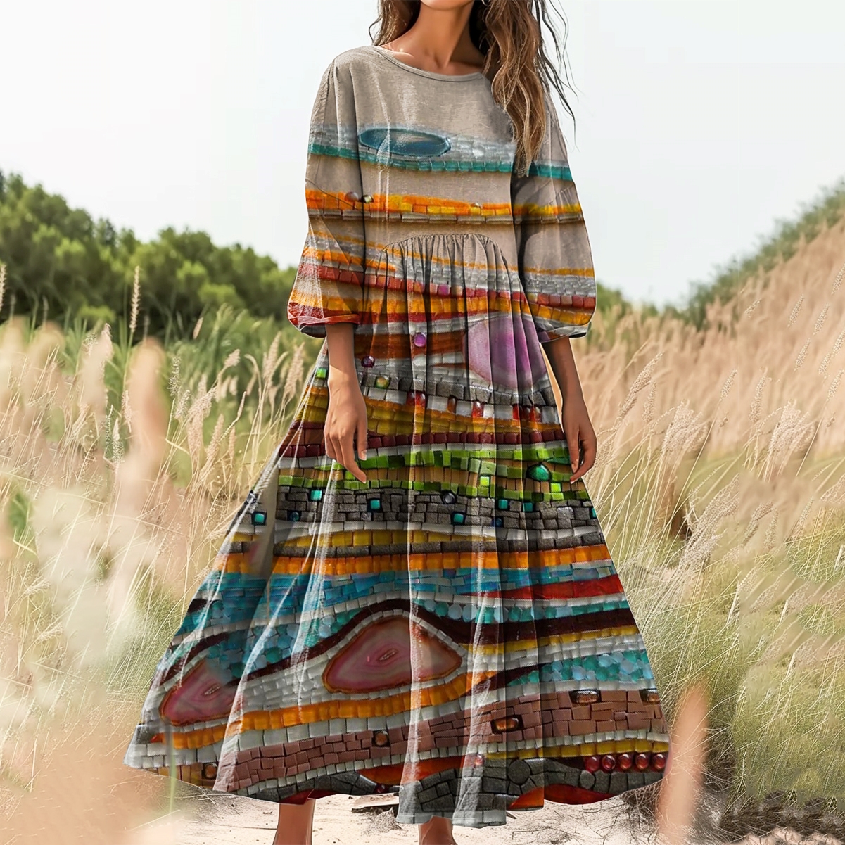 Women's Irregular Stripe Pattern Art Print Cotton Crew Neck Dress