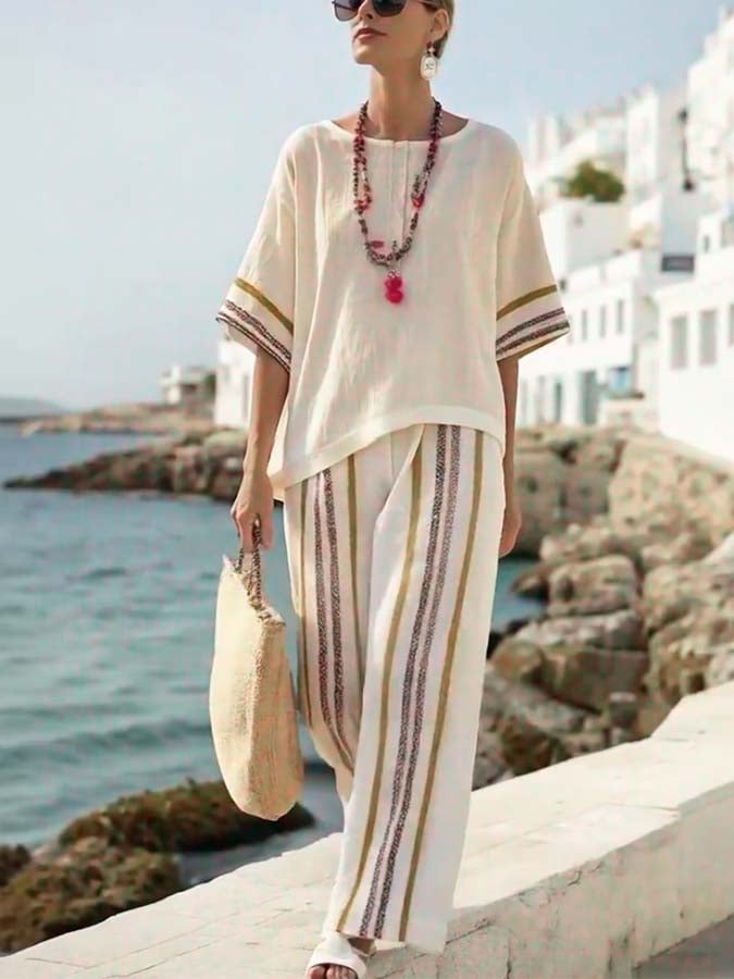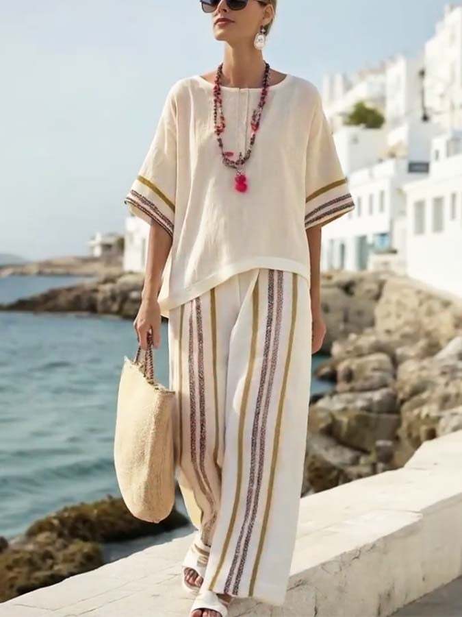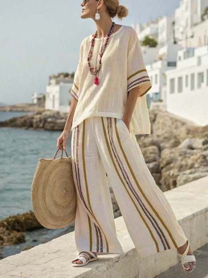 Women'S Loose Striped Printed Wide Leg Pants Set