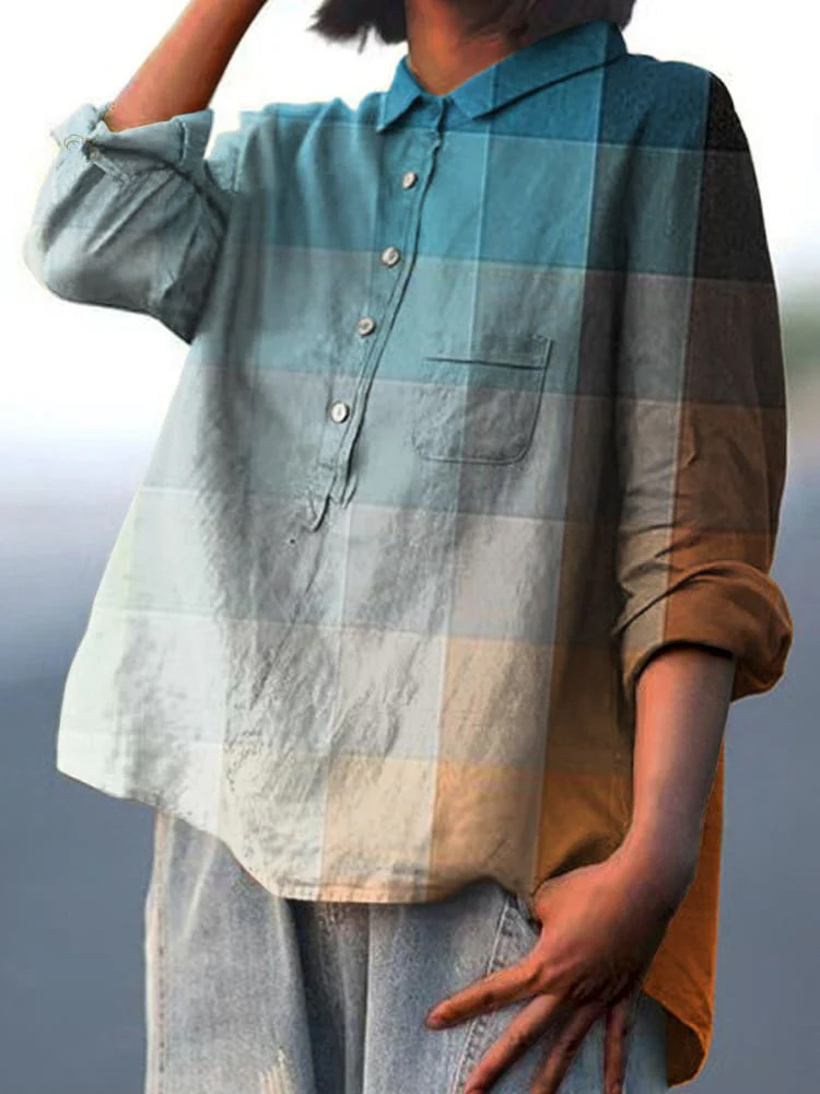 Women's Orange Blue Art Mosaic Gradient Art Print Casual Cotton And Linen Shirt