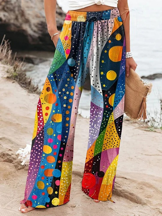 Women's Rainbow Colored Abstract Print Cotton And Linen Casual Pants