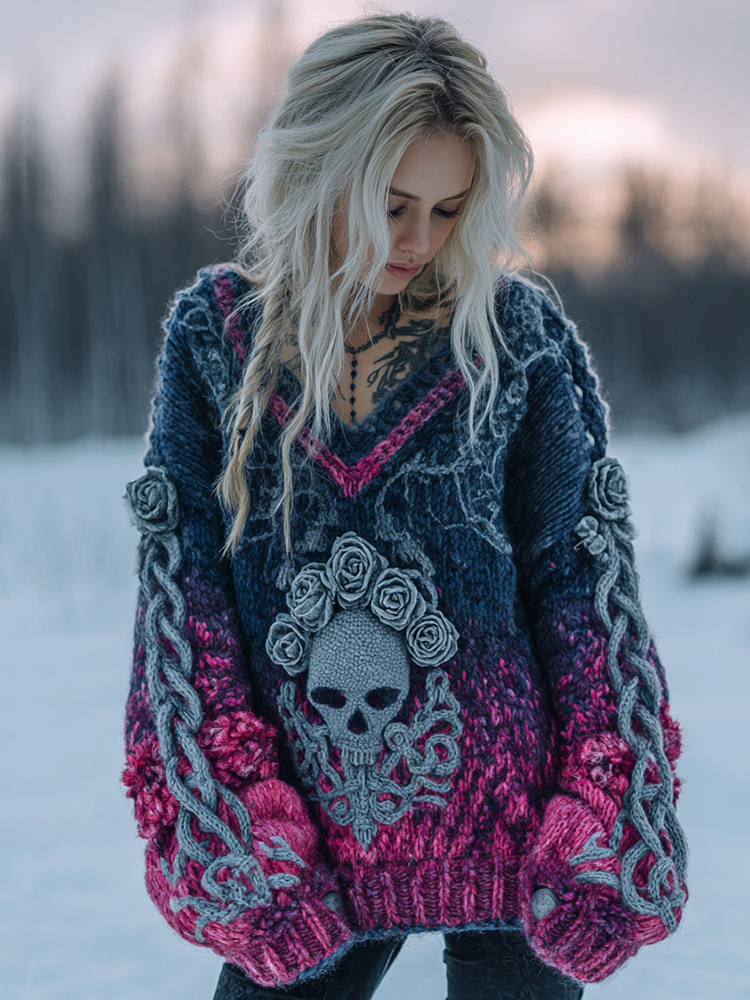 Women's Retro Celtic Knot Skull Gradient V-neck Sweater