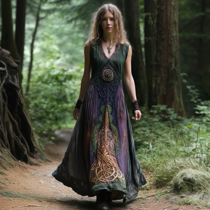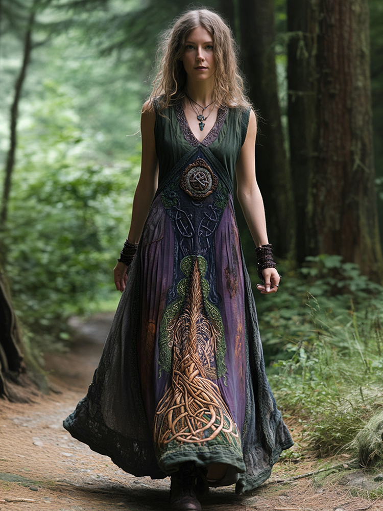 Women's Vintage Celtic Knot Tree Of Life Pattern V-neck Tank Midi Dress