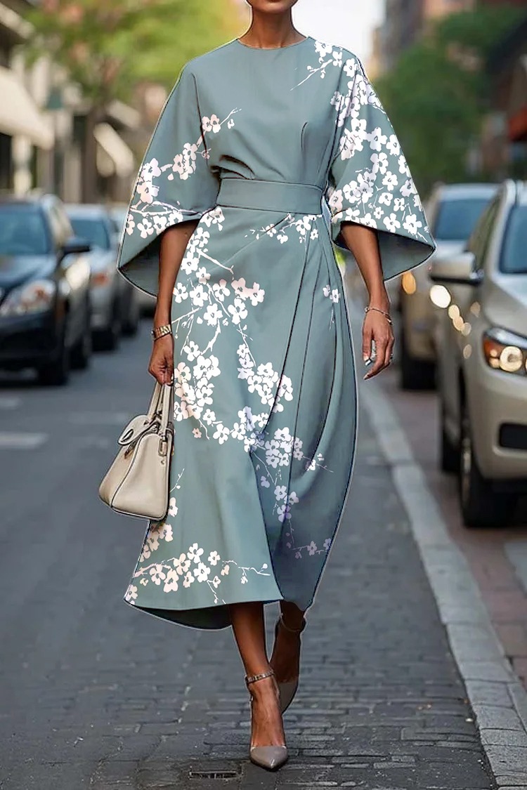 Women's Vintage Elegant Japanese Plum Blossom Print Midi Dress