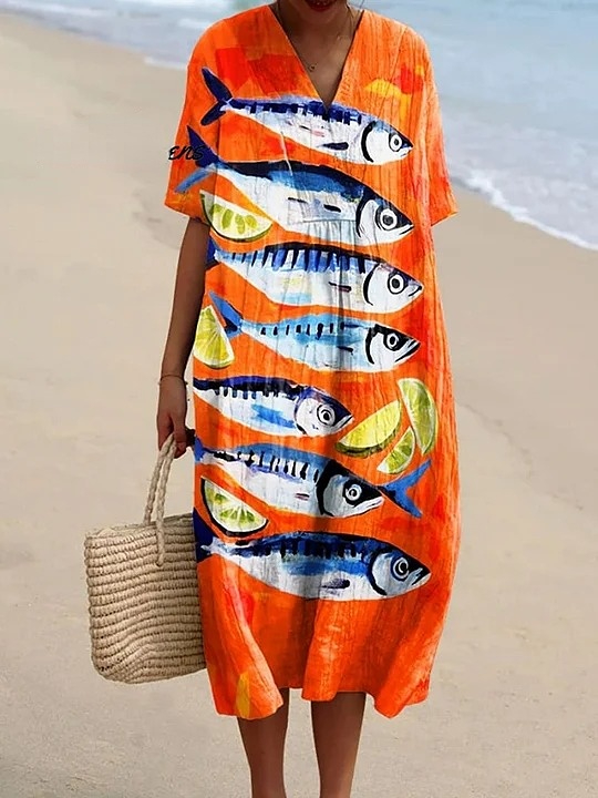 Women's Vintage Fish Sardine Art Print Flowy Dress