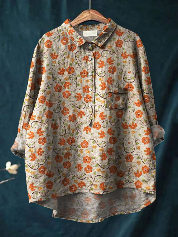 Women's Vintage Orange Flower Art Print Casual Cotton And Linen Shirt