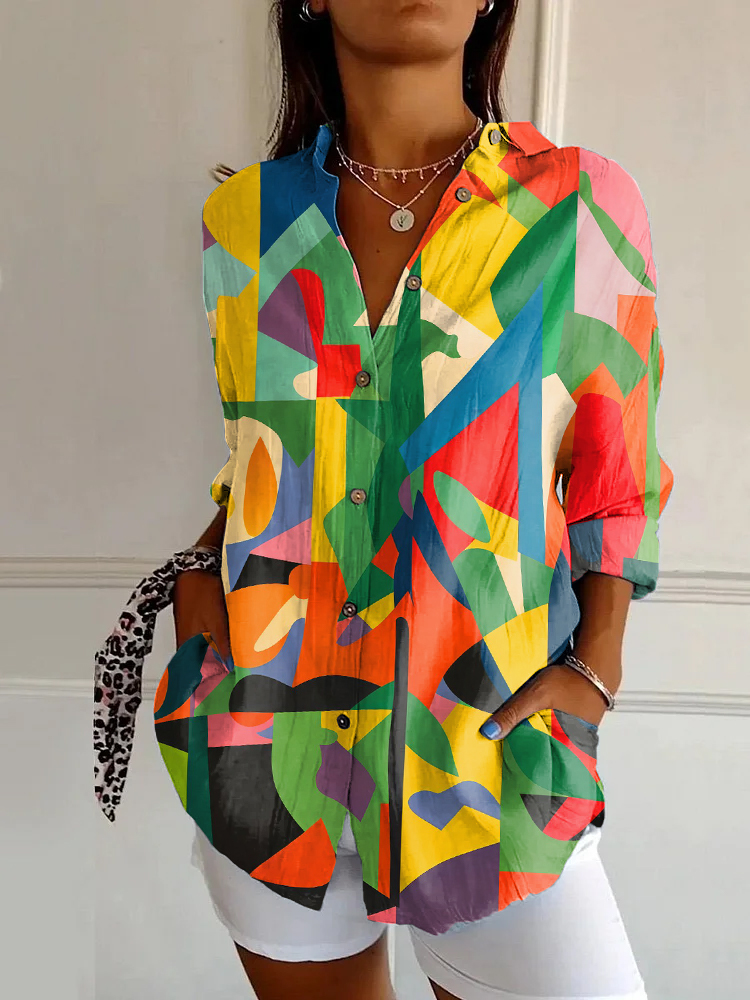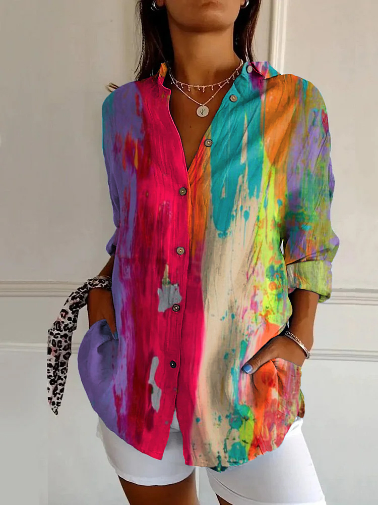 Colorful Abstract Painting Printed Women's Casual Cotton Shirt