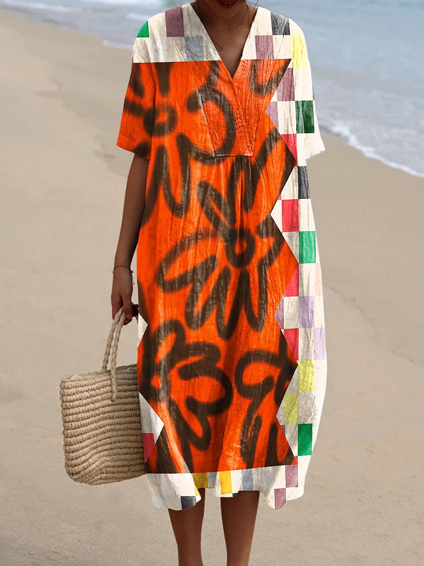 Vintage Orange Abstract Art Print Loose V-Neck Cotton and Linen Shirt