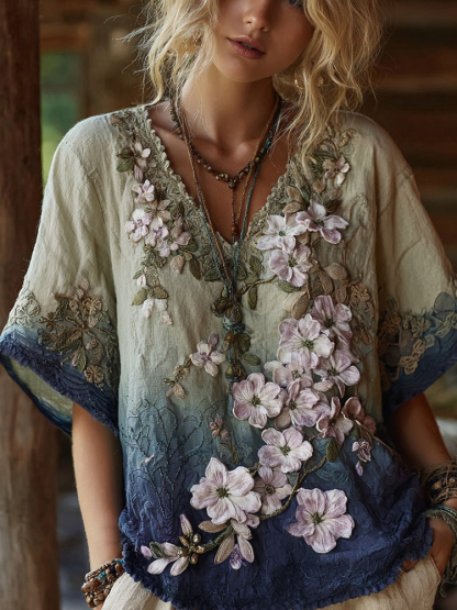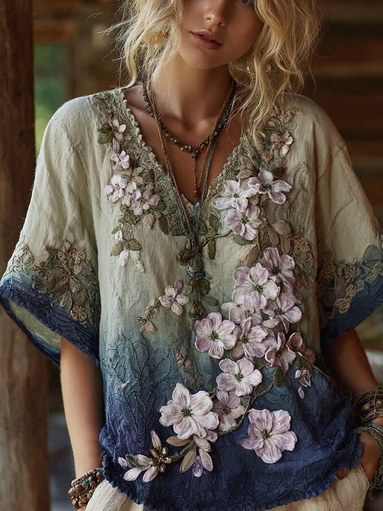 Classy Gradient Japanese Sakura Embroidered Linen Short Sleeve Shirt