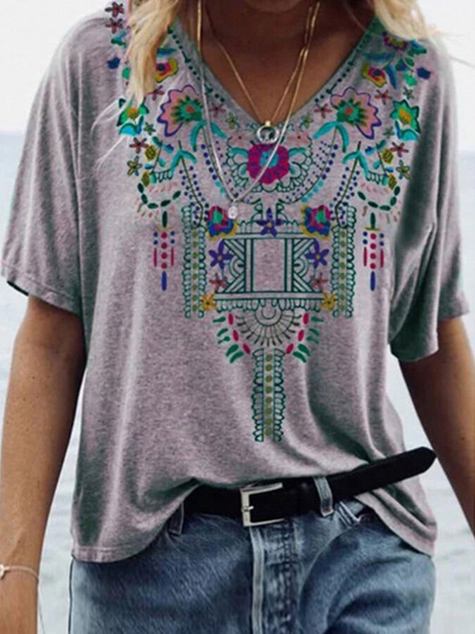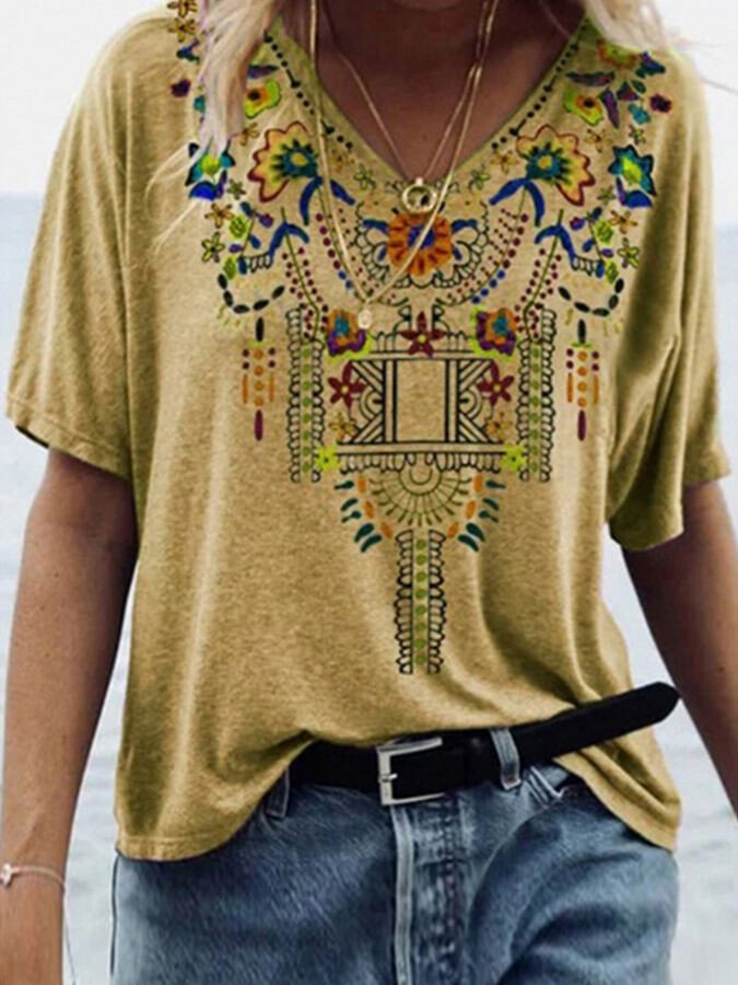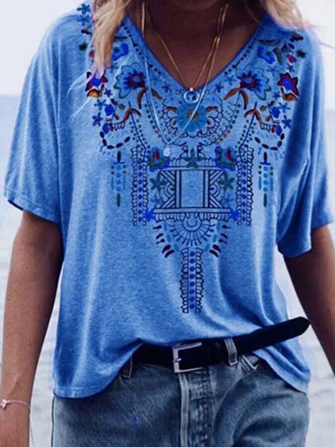 Ladies Spring/Summer V-Neck Ethnic Print Short Sleeve T-Shirt