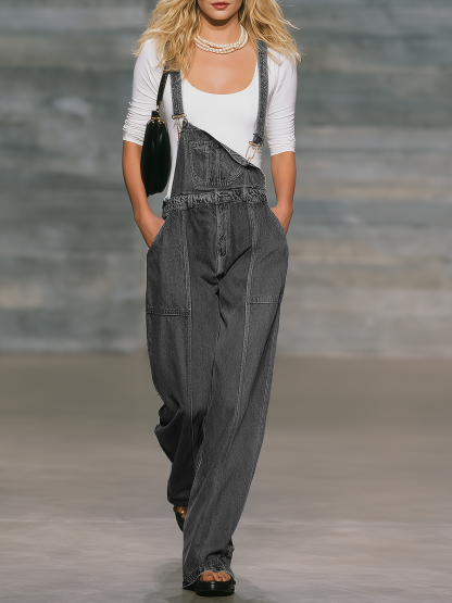 These loose-fitting, casual wide-leg gray denim overalls capture an effortless balance of comfort and urban cool. Crafted from soft, washed gray denim, they exude a lived-in charm while maintaining a sturdy, contemporary structure. The relaxed silhouette drapes naturally, enhanced by wide-leg styling that adds movement and a touch of modern edge. Classic dungaree details — adjustable shoulder straps, a front bib, and functional pockets — keep the piece timeless while the gray tone introduces a sleek, minimalist twist.