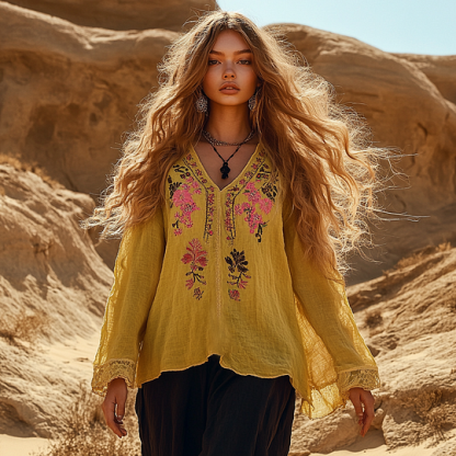 Vintage Holiday Bohemian Style Linen V Neck Long Sleeve Shirt