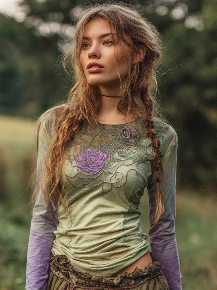 Vintage Purple Rose Embroidery Women's Gradient Long Sleeve Shirt