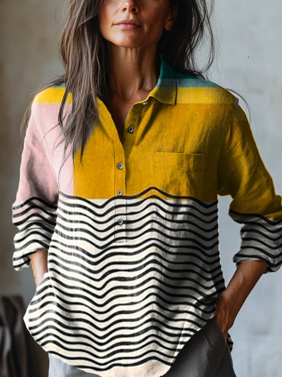 Women's Abstract Geometric Line Pattern Art Print Casual Cotton And Linen Shirt
