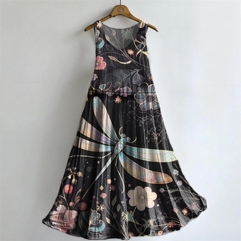 Women's Bohemian Floral Dragonfly Art Print Crew Neck Sleeveless Cotton Pocket Dress