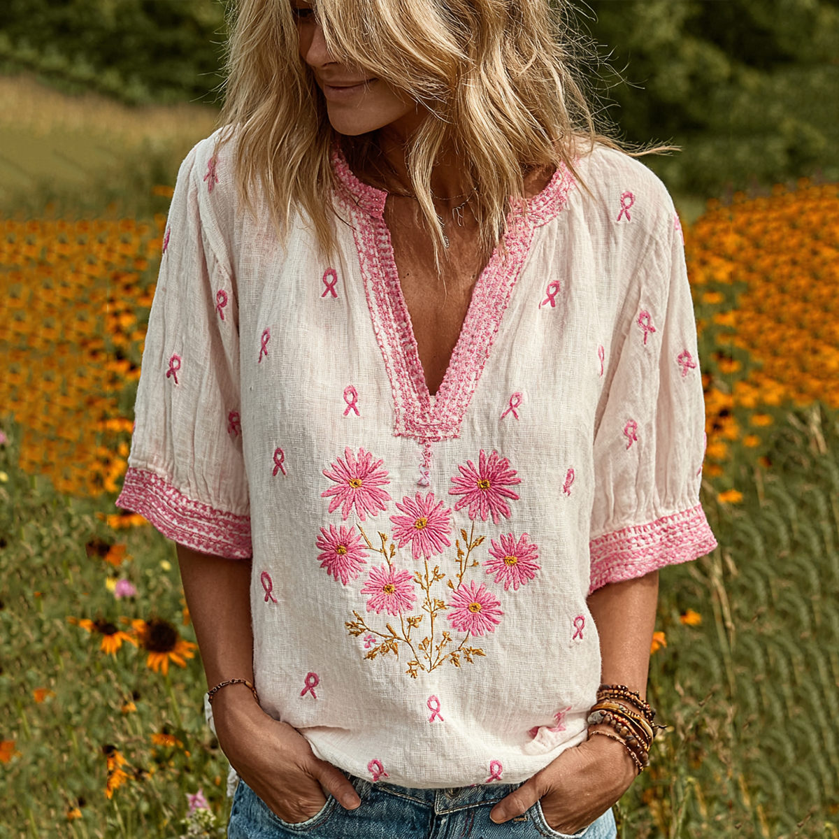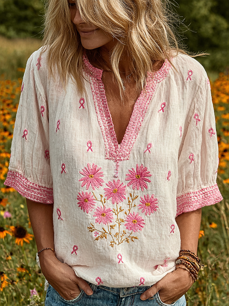Women's Breast Cancer Awareness Daisy Flower Small V Neck Shirt