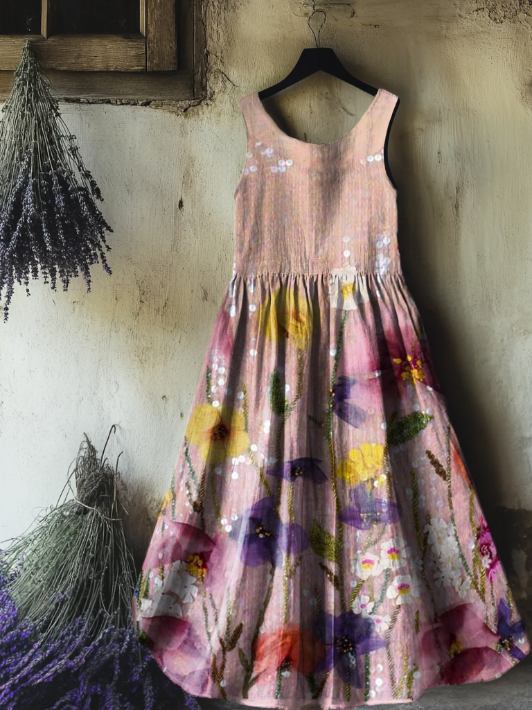 Women's Floral Art Print Round Neck Sleeveless Cotton Pocket Dresses